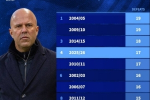 体育资讯4月9日讯 在欧冠淘汰赛首回合,利物浦0-2不敌巴黎。这是利物浦本赛季各项赛事第17场失利,以下为利物浦本世纪单赛季输球场次榜: