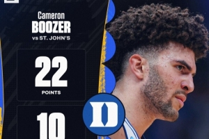 杜克大学本届状元大热卡梅隆·布泽尔表现亮眼,他出战38分钟,16投7中,三分1中0,罚球9中8,砍下22分10篮板3助攻1盖帽的全面数据。